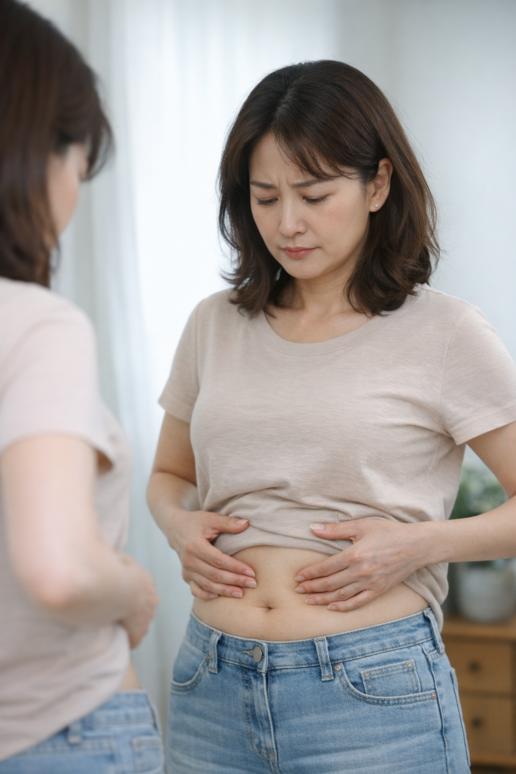 40대 이후에는 여성호르몬인 에스트로겐이 감소하면서 지방이 복부와 허벅지에 집중적으로 저장되기 쉬워집니다. 또한 근육량이 자연스럽게 줄어들어 같은 양을 먹어도 살이 더 잘 찌는 구조가 됩니다.